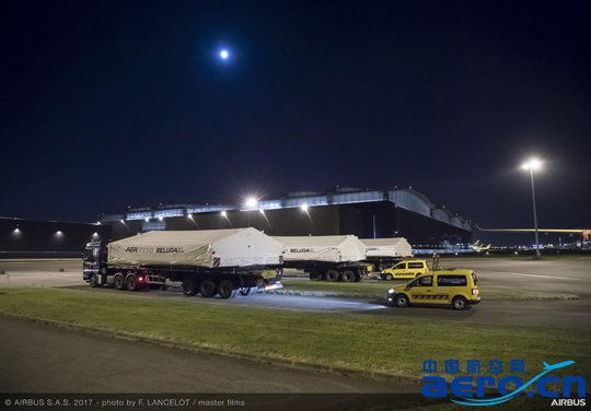 2017年4月12日,圖盧茲 – 空客新一代運輸機“超級大白鯨(BelugaXL)”的首架份大部件今天運抵位于法國圖盧茲的飛機總裝廠房(L34)。