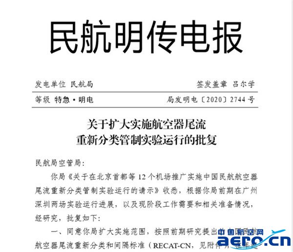 12月31日北京時間零時,國際民航組織新一輪的航空情報資料生效日,我國民航空管開始在北京首都、北京大興、上海虹橋、上海浦東、杭州蕭山、南京祿口、鄭州新鄭、武漢天河、成都雙流、重慶江北、昆明長水和西安咸陽12個機場推廣實施航空器尾流重新分類實驗運行。