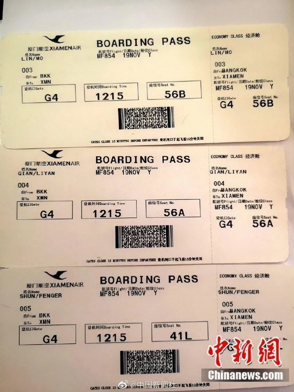 媽祖(原名林默)、千里眼和順風(fēng)耳從曼谷返回廈門的登機(jī)牌。圖片來源:中新網(wǎng)
