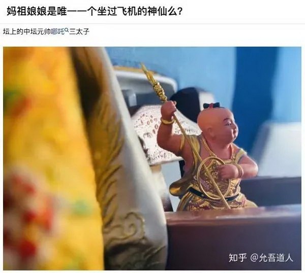 在知乎上,更是有“媽祖娘娘是唯一一個(gè)坐過飛機(jī)的神仙么”的討論。而一位叫德恩堂道學(xué)的網(wǎng)友回答道:“數(shù)數(shù)我們壇上坐飛機(jī)的神明:九天應(yīng)元雷聲普化天尊,保生大帝,媽祖,閭山陳夫人,馬、趙、溫、關(guān)四大元帥,玄天上帝。”